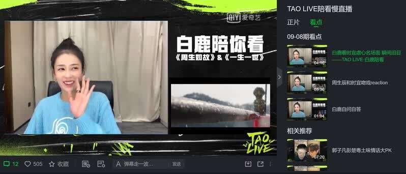 数据显示,去年爱奇艺的TAO LIVE“高光时刻”是演员白鹿陪看《周生如故》大结局和《一生一世》时,最高人气逾40万。特别是在看《周生如故》时,白鹿看到自己表演忍不住流泪的场景,一度在社交媒体上引发热议。