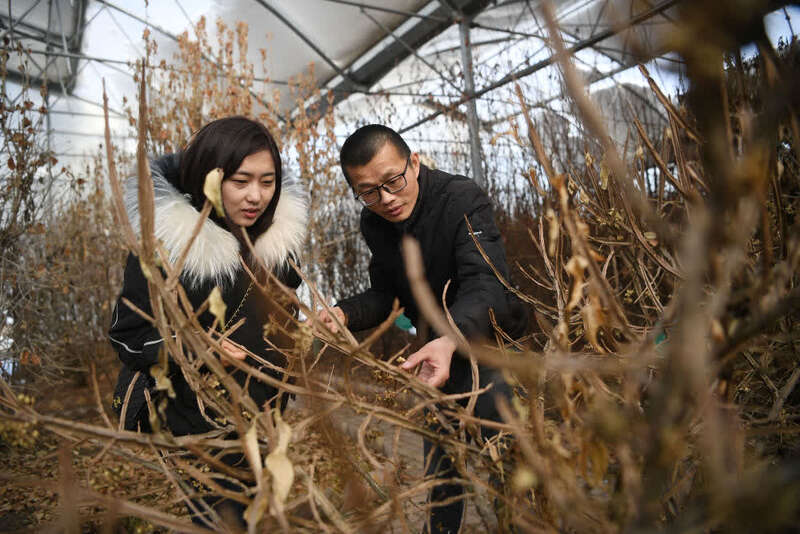 郑国华(右)给泾源县当地苗木企业工作人员讲解“卫矛”生长情况。(新华社记者王鹏摄)