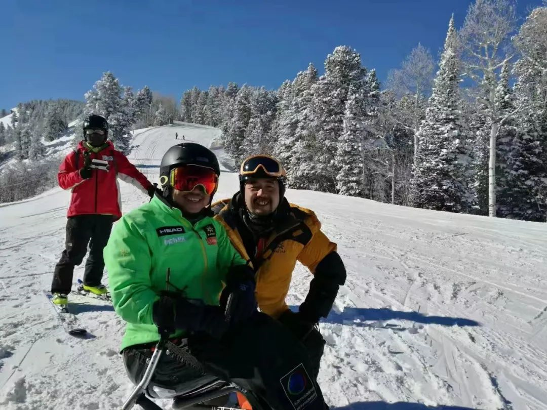 冯冀在美国阿斯本拍摄轮椅滑雪者钟承湛