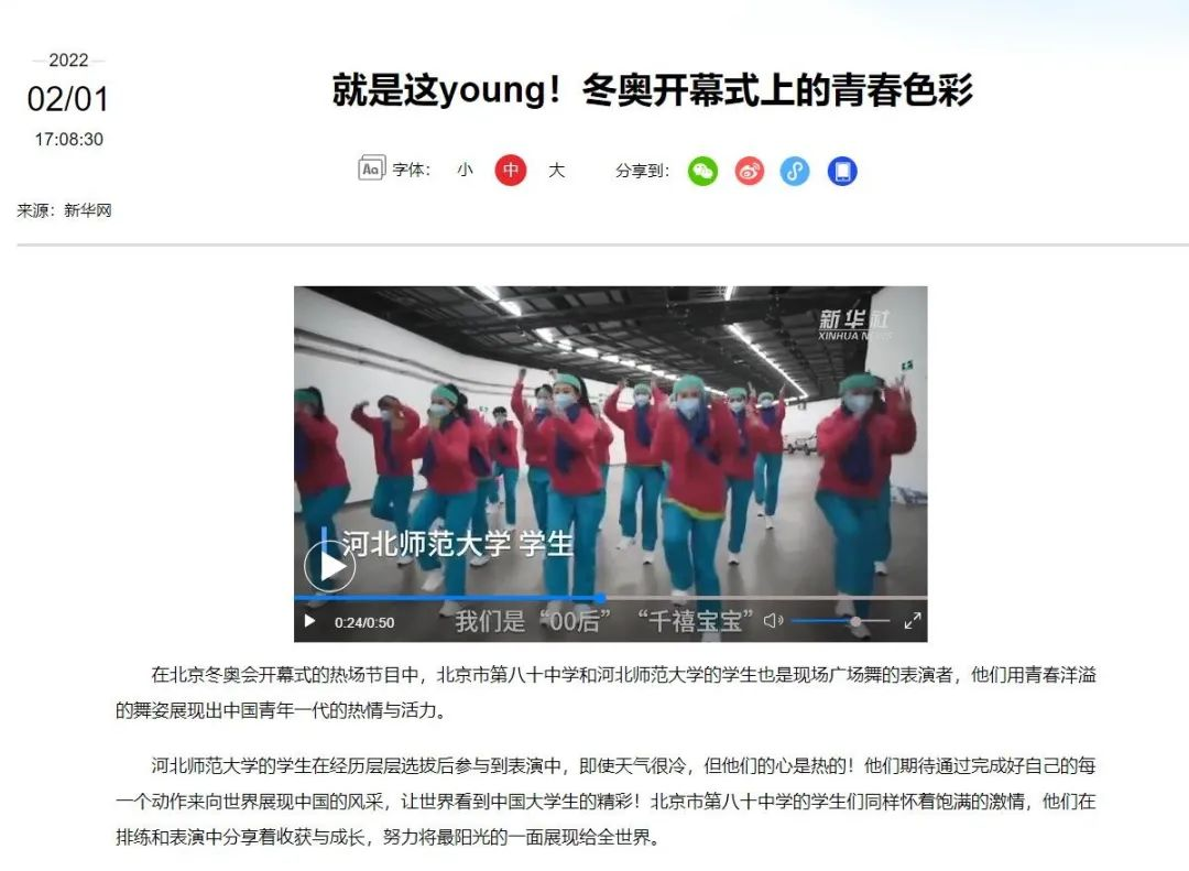 在国家体育场开幕仪式前的表演环节中,我校演职团队是28支表演团队中最早出场的队伍,40分钟的表演贯穿六个篇章,他们用流行舞、现代舞、民族舞等方式表达了燕赵儿女对北京冬奥会的热切期盼和祝福,向全世界展示了当代青年热情洋溢、自信奋进的青春风采。