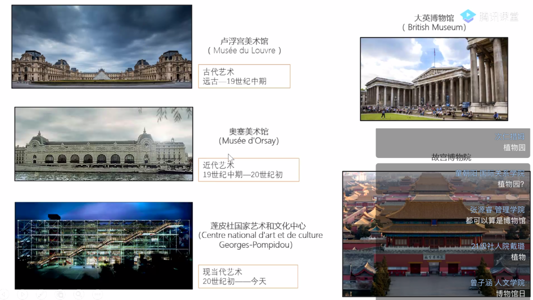 这门美育课以西方著名的艺术类博物馆为教学线索,结合黄珊的亲身游览经历,引导同学们通过虚拟游览,赏析博物馆内著名艺术作品,理解艺术与文化、历史、生活的关联。