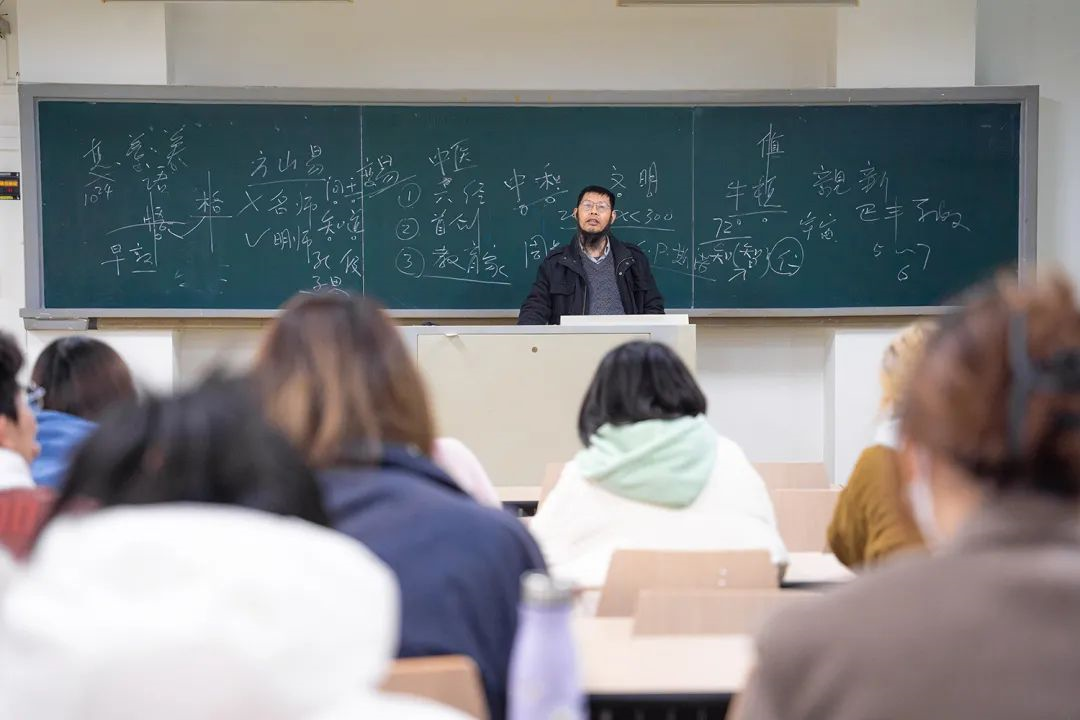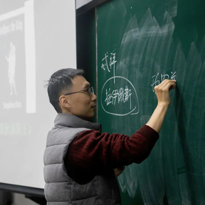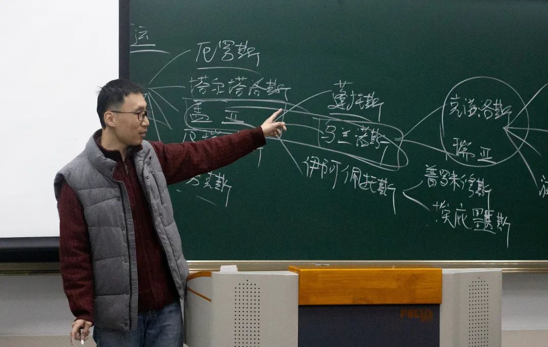 人文学院杨松教授幽默的话语引得在场同学忍俊不禁。他在黑板上列下古希腊神的部分谱系,绘声绘色地讲述着神话与文学故事。