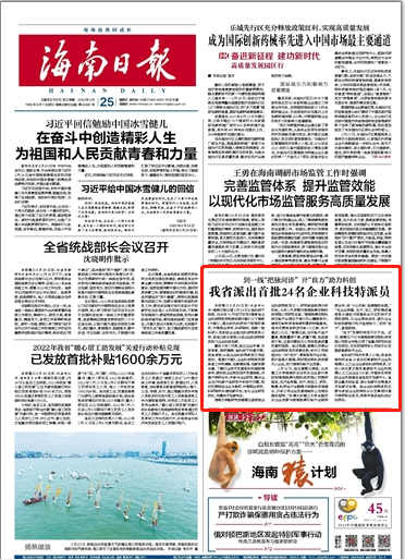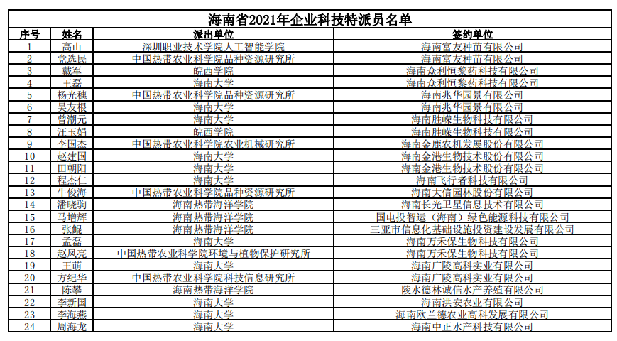 2021年10月,我省印发《海南省企业科技特派员制度实施方案》,提出依托科研实力较强的高校、中等职业学校、科研院所,选拔一批工作热情高、创新意识强、创新资源丰富、了解行业技术发展现状和趋势的科研人员,派驻企业担任科技特派员,进一步提升企业科技创新能力和水平。 作为我省首批企业科技特派员,曾潮元今年1月受聘为海南胜嵘生物科技有限公司研发总监,与该公司开展深度产学研合作。