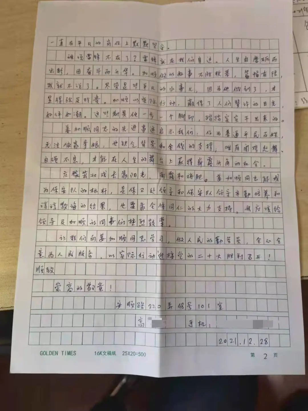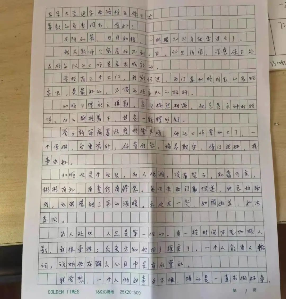 学校保卫处总是收到校内教职员工对姜加顺的点赞反馈或者亲笔感谢信,感谢姜加顺的尽责服务、用心工作,以及帮取快递、帮助搬运重物等助人为乐的“雷锋”行为。“雷锋”不会被忘记,雷锋精神是时代永恒的主旋律。
