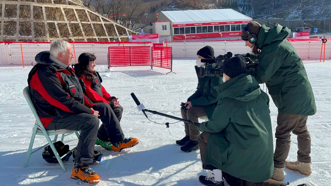 国家跳台滑雪中心的赛时实习生为转播商提供信息服务