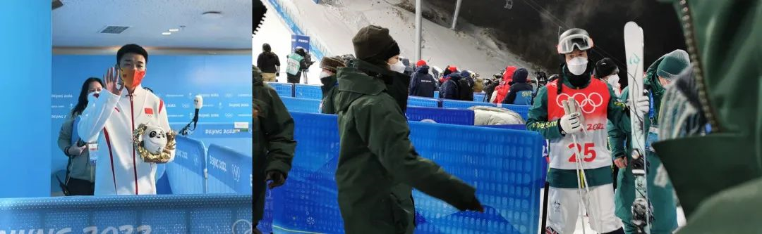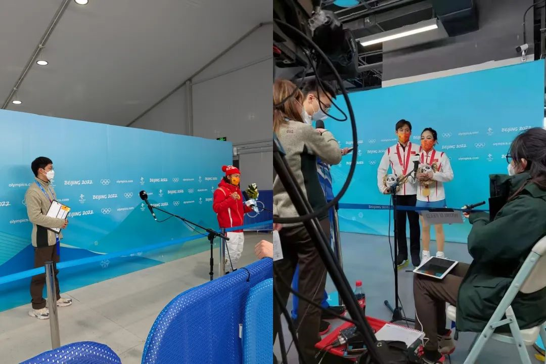 我国运动员苏翊鸣、韩聪和隋文静夺冠后,我校学生在协助采访工作