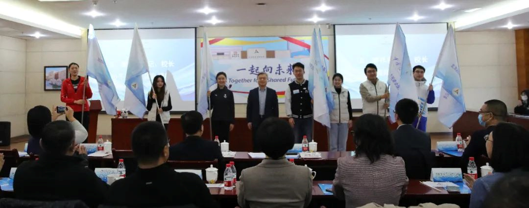 中国传媒大学党委书记、校长廖祥忠为媒体转播实习生团队授旗