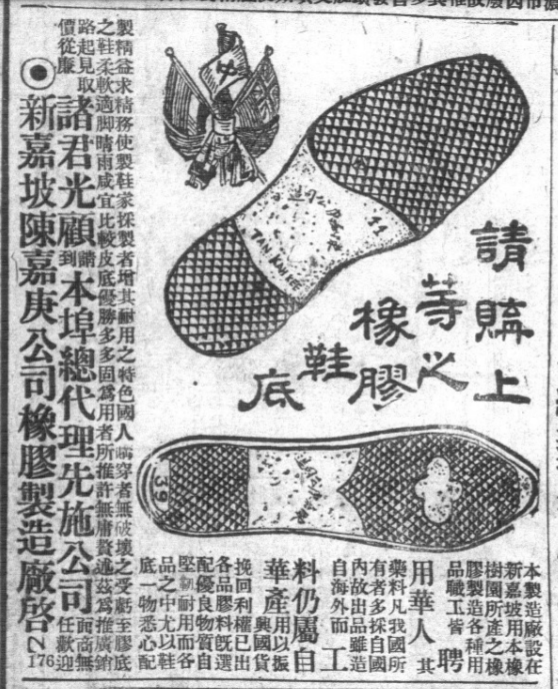 门类齐全。1925年,陈嘉庚将公司发展至顶峰,成为名副其实的“东南亚橡胶大王”,但经营范围远远不止橡胶一个行业。《申报》1920年刊登的全是其鞋类广告,到1923年开始出现各类轮胎广告,到1925年开始出现糖果饼干类广告,到1928年又出现了菠萝罐头和中西药品广告。