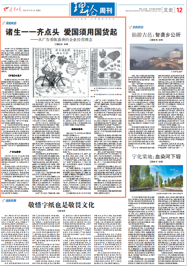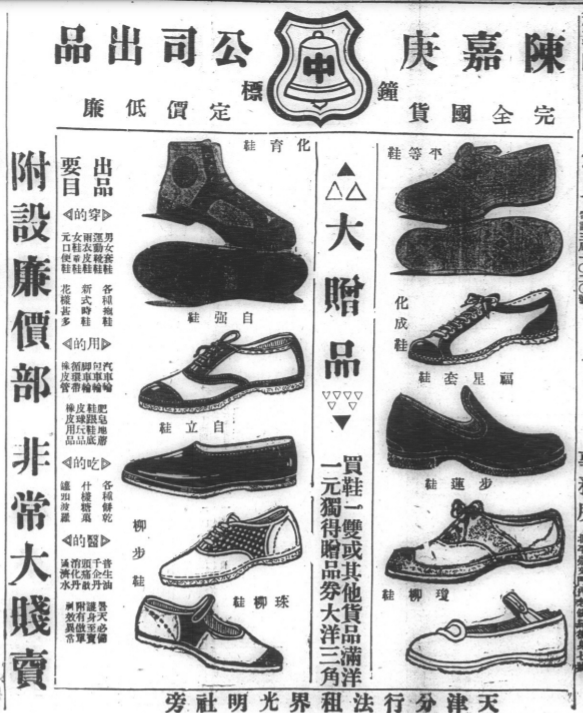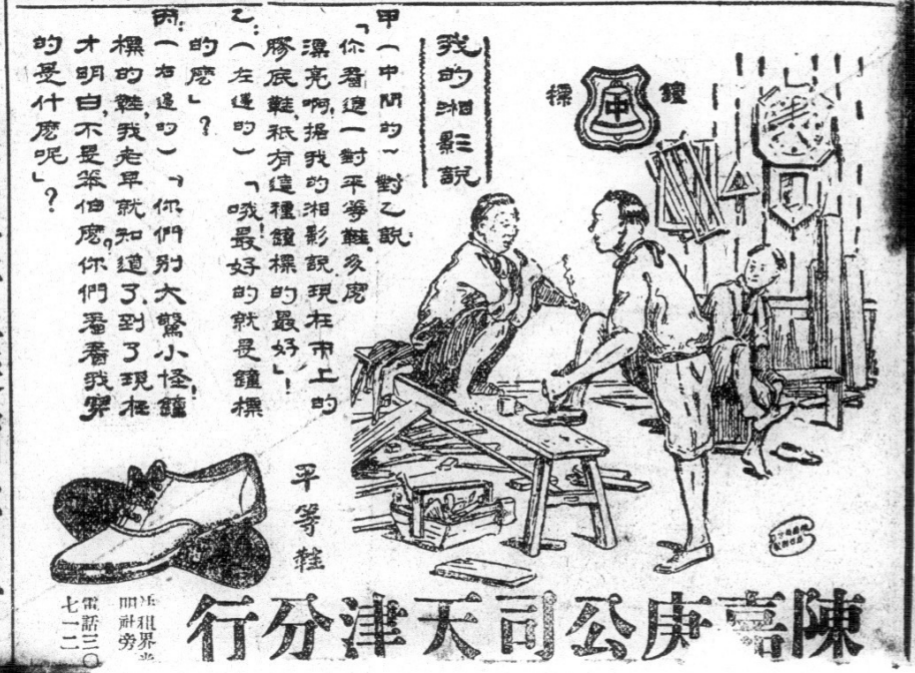 1930年10月21日《北洋画报》上刊登的广告采用了七言诗的形式:先生早起出讲堂,第一注意学生装。你们全身所服用,是否国货抑外洋?一生敬谨答老师,专用国货已多时;学生所穿的靴鞋,买于陈嘉庚公司。先生闻言大欢喜,更望诸生都如此。诸生一一齐点头,爱国须用国货起。