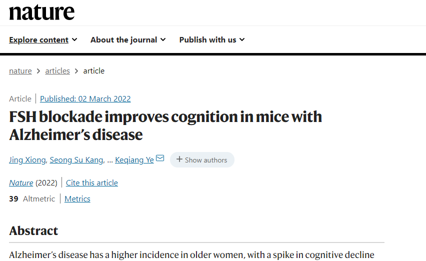 北京时间3月3日凌晨,最新一期《自然》杂志(Nature)在线发表了武汉大学人民医院神经内科熊婧副主任医师为第一作者的研究论文《抑制卵泡刺激素的作用可以改善阿尔茨海默病小鼠的认知功能障碍》“FSH blockade improves cognition in mice with Alzheimer’s disease”。