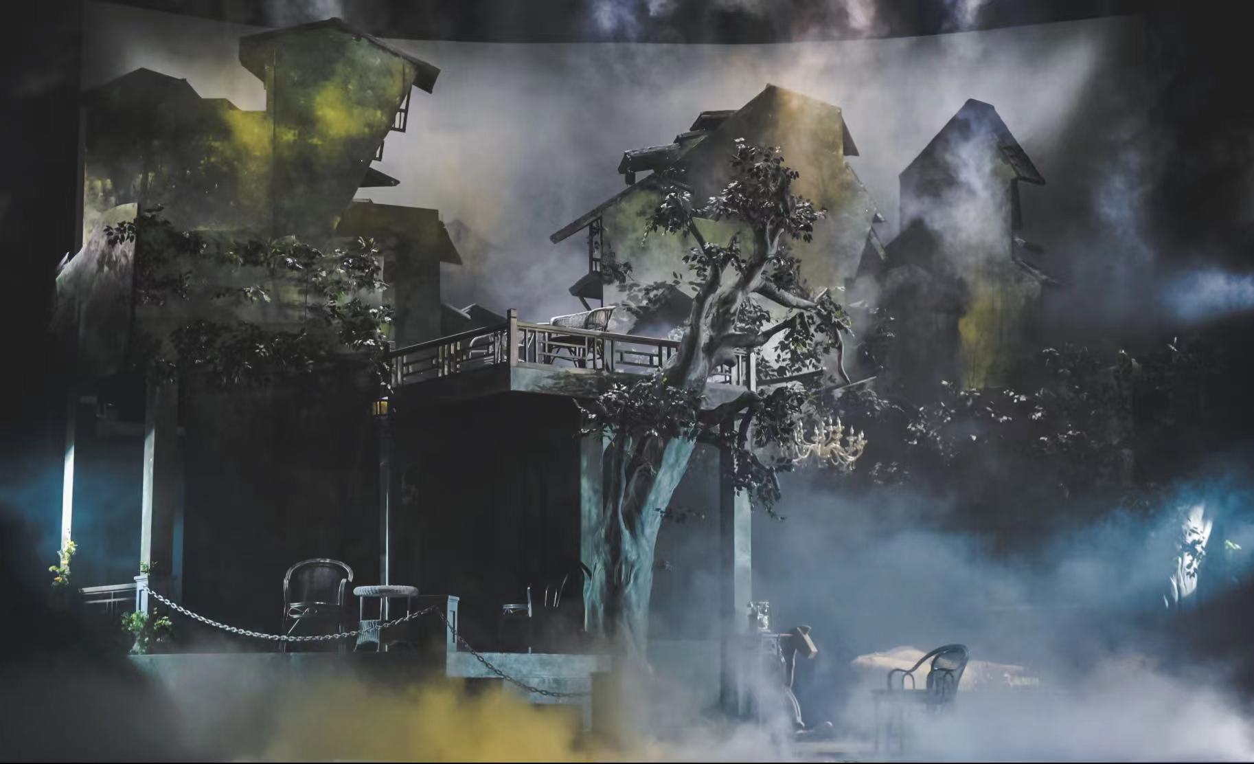 1940年至今,《雾重庆》已经进行了五次排演。新版作品中关于“雾”的意象解释,并不仅仅局限于自然景观:舞台设计中,加入“水雾”;舞美设计中,使用重庆高低错落的地形与吊脚楼,来突出青年人到此之后感受到的“心理落差”与迷茫;服装设计创作中,用色彩饱和度呼应角色心中的“雾”感和纠结。