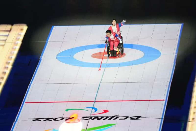 所有人都盯着冰壶,屏息凝神。上一秒,两位运动员坐在轮椅上推出发光的冰壶,当它最终进入营垒的一刻,北京2022年冬残奥会开幕式正式开始。