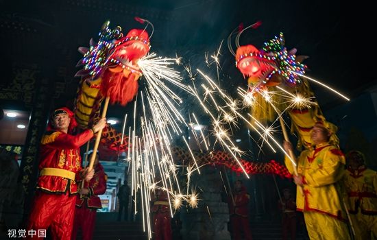 2022年3月3日晚,江西省新余市仙女湖区观巢镇洋潭村农民架篝火、舞长龙,载歌载舞祈福五谷丰登,喜迎“二月二”春耕节。俗语“二月二、龙抬头”,江西省新余市保留着数百年传统习俗的村民每逢佳节,舞龙祈福,传达美好祝愿。