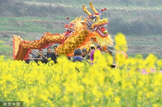 2022年3月3日,重庆涪陵泡桐村,村民们在金黄色的油菜花地中舞龙祈福,迎接“龙抬头”。农历二月二日是“龙抬头”,又称春耕节、农事节、青龙节、春龙节等,是中国民间传统节日。自古以来人们亦将“龙抬头”作为一个祈求风调雨顺的日子。 中新社记者 陈超 摄