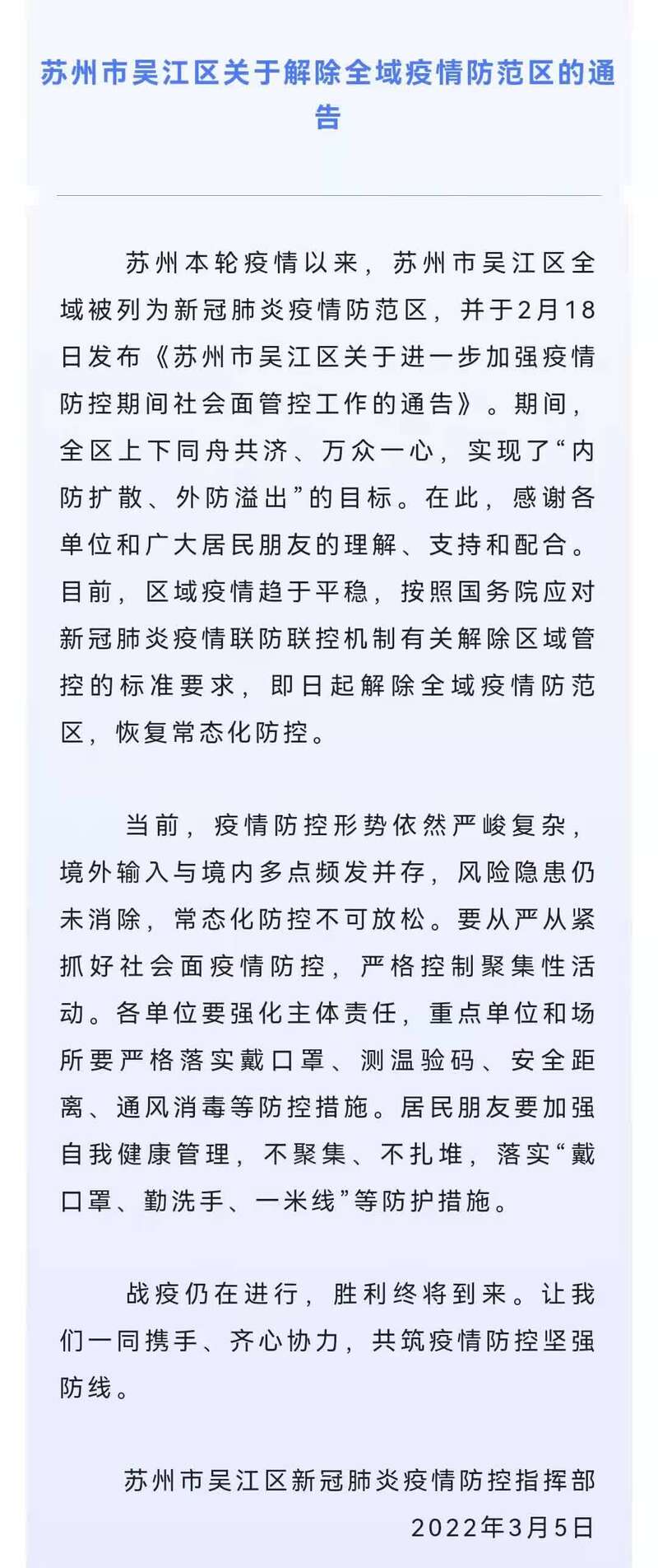 3月5日,江苏苏州市吴江区新冠肺炎疫情防控指挥部发布消息,苏州本轮疫情以来,江苏苏州市吴江区全域被列为新冠肺炎疫情防范区,并于2月18日发布《苏州市吴江区关于进一步加强疫情防控期间社会面管控工作的通告》。目前,区域疫情趋于平稳,按照国务院应对新冠肺炎疫情联防联控机制有关解除区域管控的标准要求,即日起解除全域疫情防范区,恢复常态化防控。