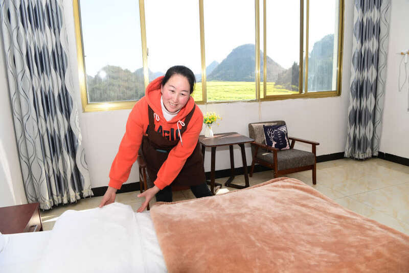 2月28日,罗平县板桥镇金鸡村村民陈红美在整理旅馆房间。她把自家的房屋改成家庭旅馆,一个花季能挣6万余元。