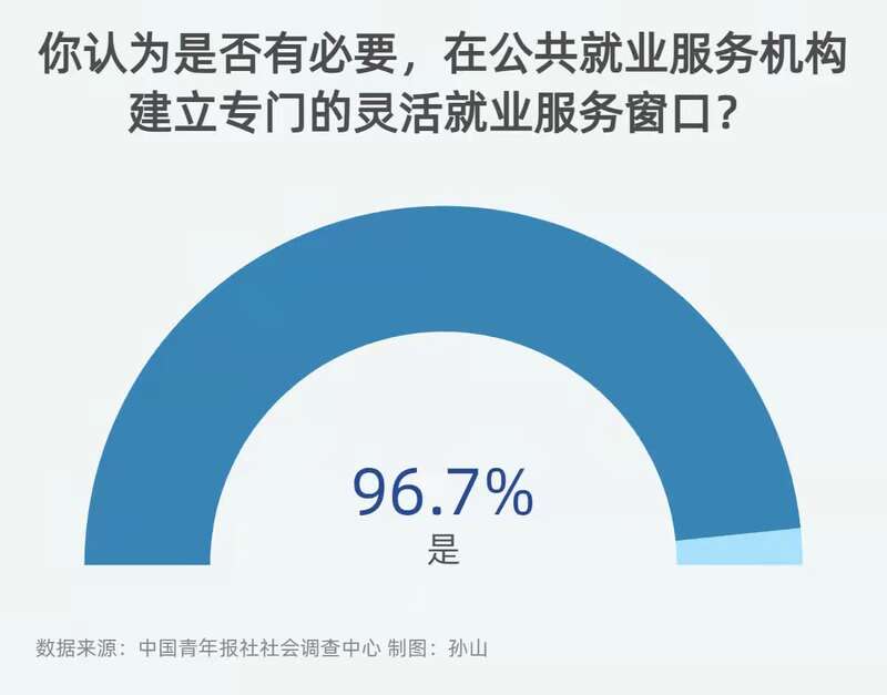 调查中,96.7%的受访者认为有必要在公共就业服务机构建立专门的灵活就业服务窗口。完善对灵活就业群体的支持,63.6%的受访者期待完善灵活就业者的职业伤害保障,57.0%的受访者期待对灵活就业人员给予社保补贴,56.1%的受访者期待完善灵活就业的劳动合同管理。