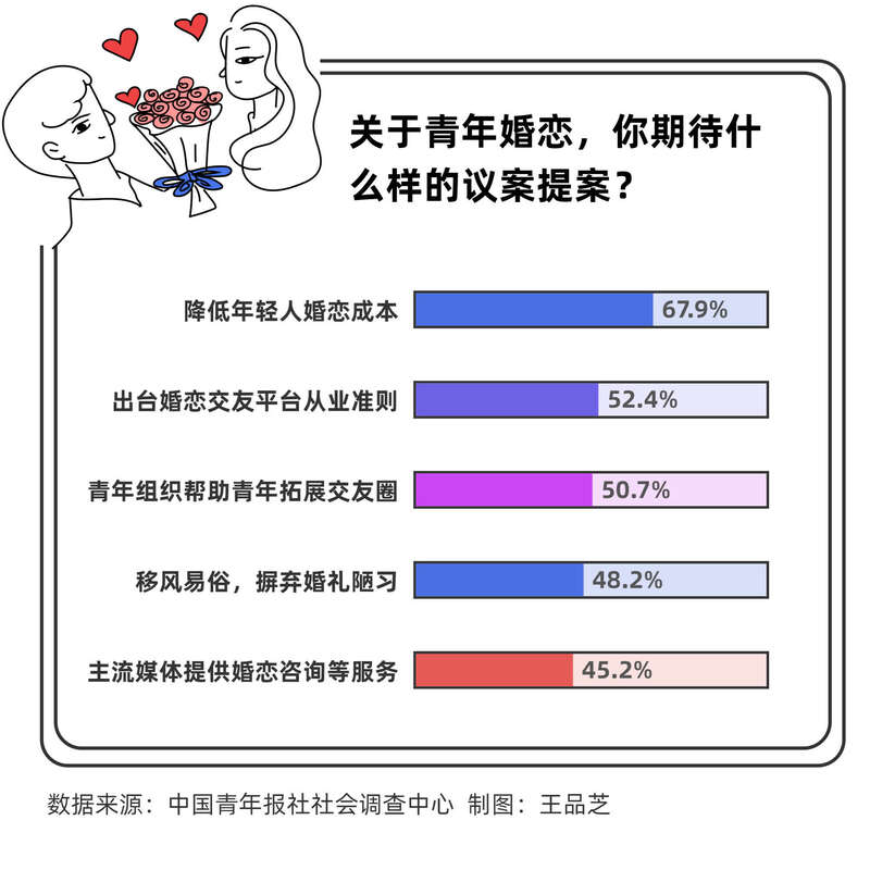 关于青年婚恋,大家期待什么样的议案提案?调查中,67.9%的受访者期待提高公共服务水平,降低年轻人的婚恋成本,52.4%的受访者希望出台婚恋交友平台从业准则,加强违规举报处理,50.7%的受访者期待青年组织帮助单身青年拓展交友圈,48.2%的受访者期待移风易俗,动员全社会摒弃婚礼陋习,45.2%的受访者建议主流媒体提供婚恋、情感咨询等公共服务。
