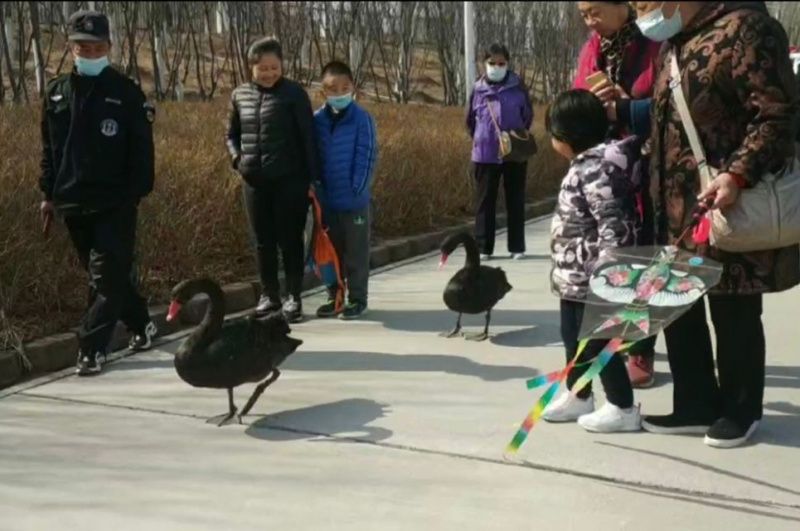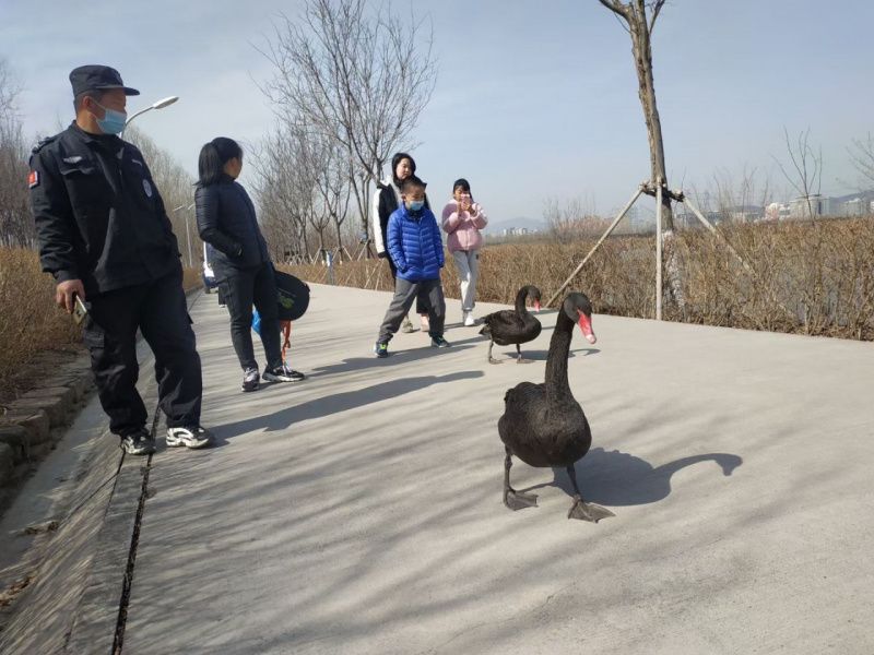 “两只黑天鹅一点都不怕人,在路边走来走去的,看起来很可爱。”3月6日上午10时许,市民李强向北京青年报爆料,他外出游玩,看到了这一幕,觉得很有意思,所以发布在微信朋友圈,引来大家好奇询问。