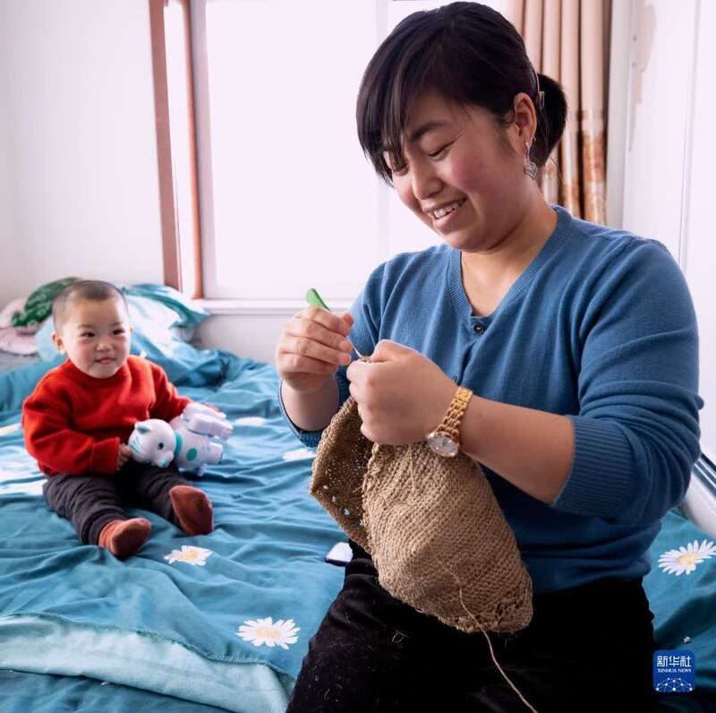 在宁夏银川市月牙湖乡滨河家园四村,村民虎海霞在家中一边编织汉麻背包一边带孩子(3月4日摄)。新华社记者 杨植森 摄