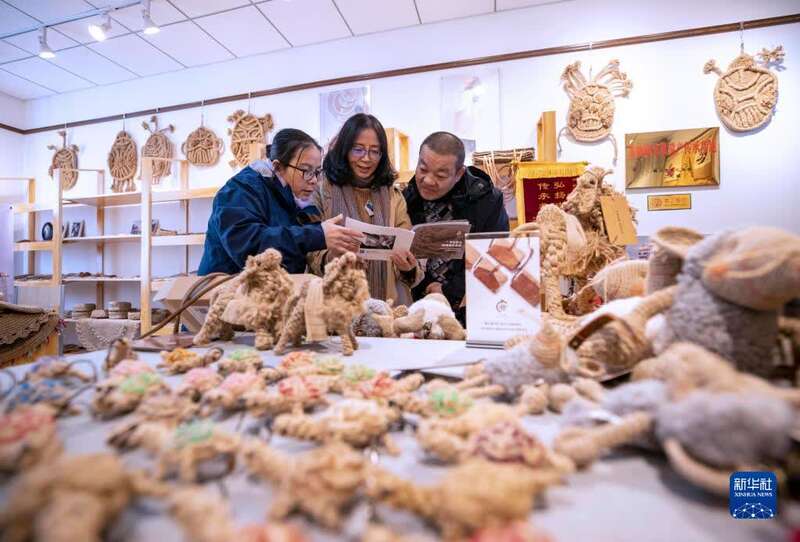 在宁夏银川市月牙湖乡滨河家园四村非遗麻编手工坊的展示厅内,张璟(中)向参观游客介绍当地村民与非遗麻编的故事(3月4日摄)。新华社记者 杨植森 摄
