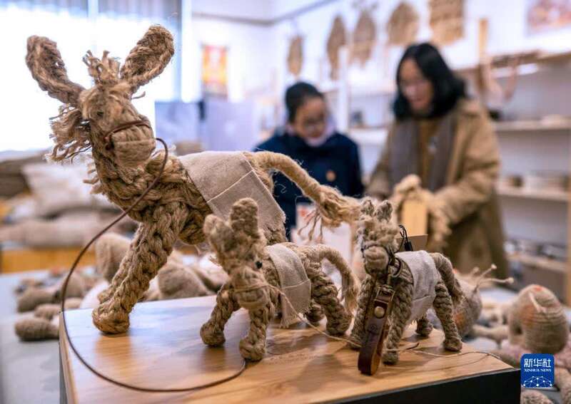 这是宁夏银川市月牙湖乡滨河家园四村非遗麻编手工坊的展示厅内展示的麻编作品(3月4日摄)。新华社记者 杨植森 摄