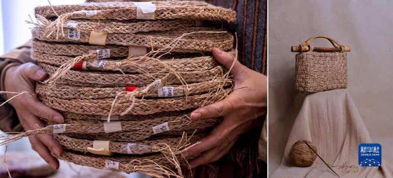 拼版照片:左图为村民制作的汉麻六股辫粗加工产品,每一盘产品上贴有村民的姓名以及编织的长度(新华社记者杨植森3月4日摄);右图为张璟用六股辫粗加工产品加工制成的包(受访者供图)。新华社发