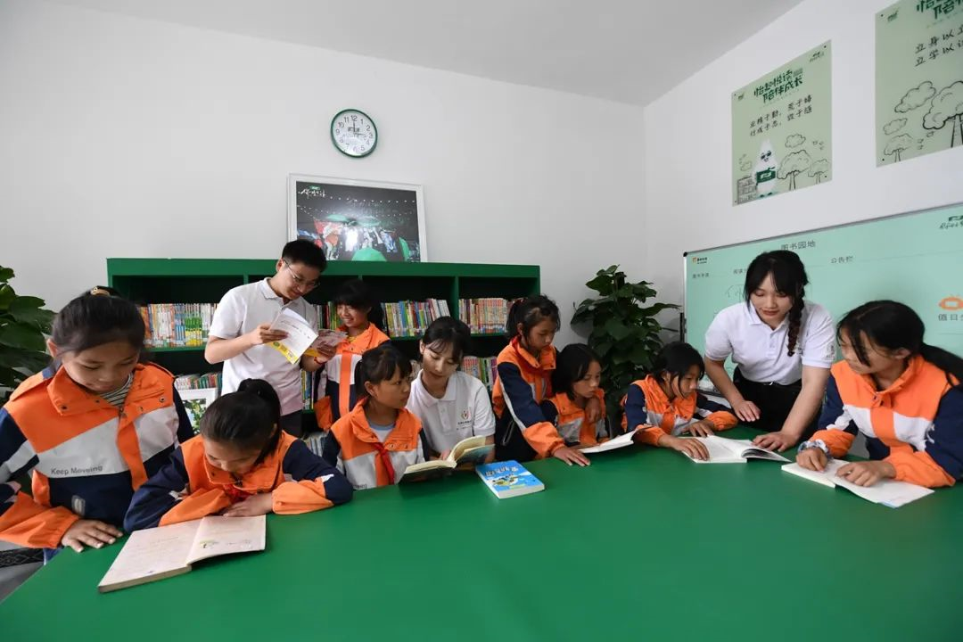 ▲志愿者与孩子们在“玩转科学”图书馆一起阅读科学书籍(田悦 摄)