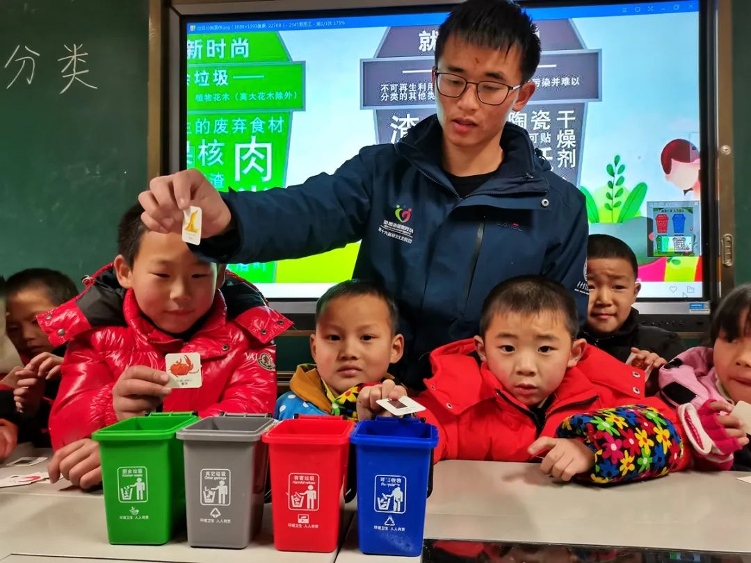 ▲张季钦带领孩子们学习垃圾分类知识(袁诗涵 摄)