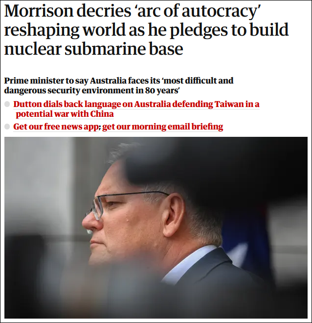 据报道,在7日的线上演讲中,澳大利亚总理莫里森还宣布,将投资100亿澳元(约74亿美元)在澳大利亚东海岸建立核潜艇基地,以便“美、英潜艇定期到访”,来停靠美英澳三边安全伙伴关系“AUKUS”框架下购买的核动力潜艇。他同时称,澳大利亚将加强其武器能力,“保护澳大利亚人的安全”。