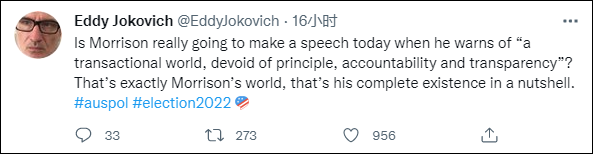 “当莫里森今天警告‘一个缺乏原则、责任和透明度的交易世界’时,他真的是在发表演讲吗?这就是莫里森的世界啊,简而言之,这就是他的全部。”