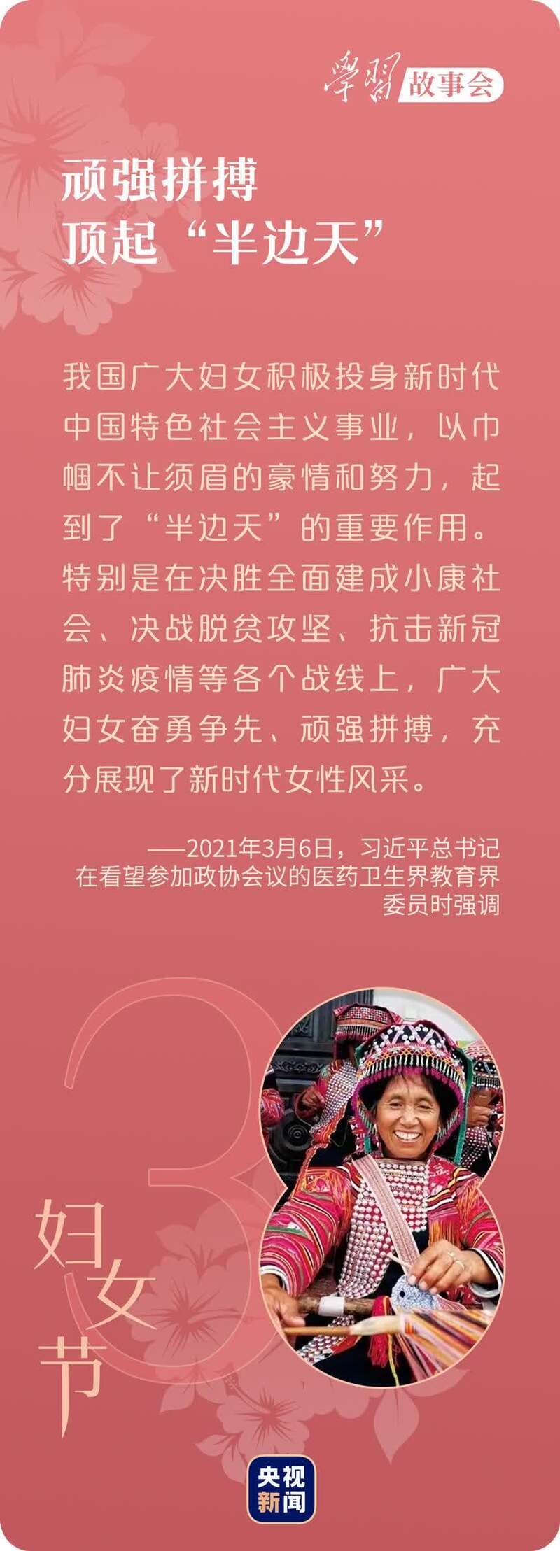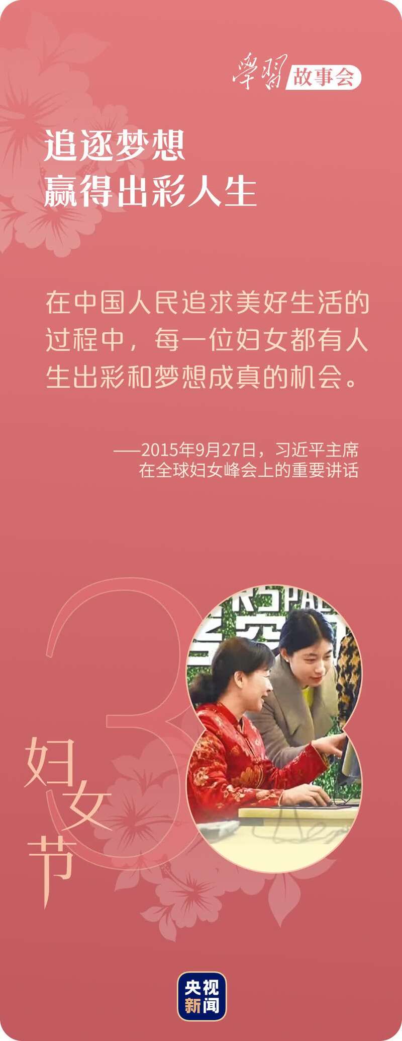 “中国将更加积极贯彻男女平等基本国策,发挥妇女‘半边天’作用,支持妇女建功立业、实现人生理想和梦想。”2015年9月,在全球妇女峰会上,习近平主席的话语掷地有声、鼓舞人心。