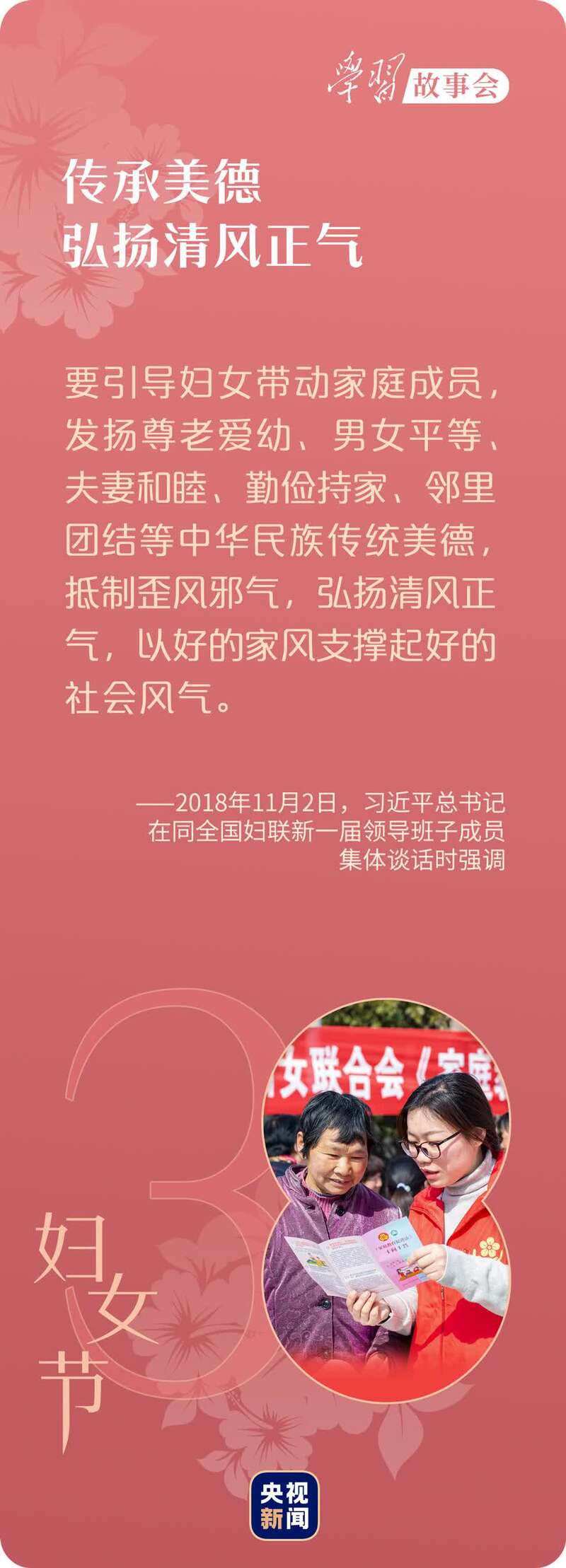 亿万女性弘扬中华民族传统美德,用自己的言行温暖他人、影响社会,汇聚坚毅的前行力量。