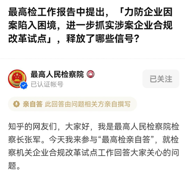 正义网北京3月9日电(见习记者王极)3月9日,最高人民检察院党组书记、检察长张军在中文互联网最大的问答社区——知乎,就涉案企业合规改革试点问题回答网友提问。张军表示,开展涉案企业合规改革试点的目的是防止不当办一个案件,垮掉一个企业;更高的目标是通过办好每一个案件,积极营造法治化营商环境,促进企业规范发展。