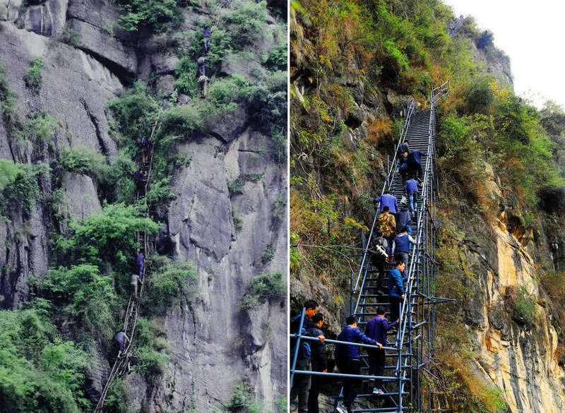 ↑某色苏不惹在通往“悬崖村”的钢梯上直播(2017年12月15日摄)。