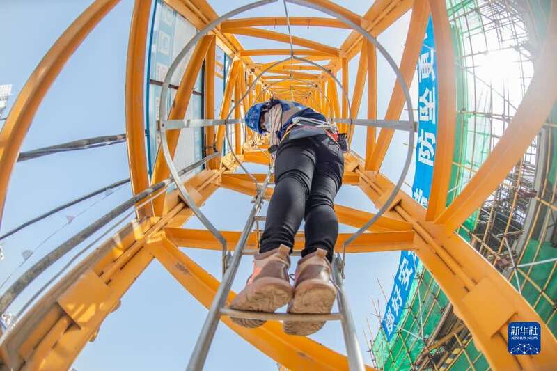 3月7日,在武汉市中建三局三公司某工地上,张晓燕爬上塔吊。新华社发(伍志尊 摄)