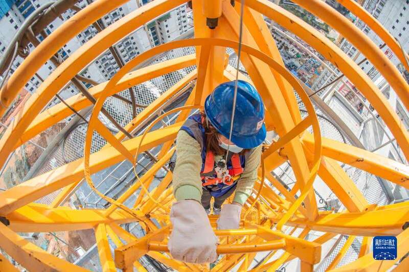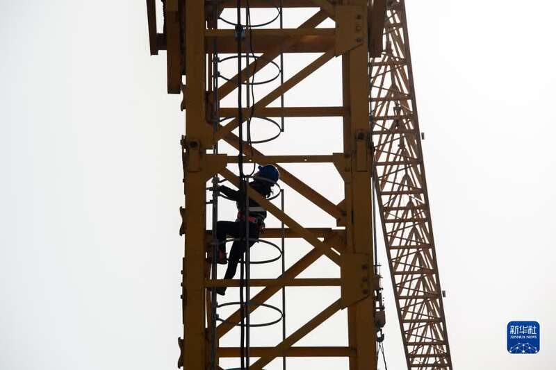 3月7日,在武汉市中建三局三公司某工地上,张晓燕在对塔吊吊臂进行安全检查。新华社发(伍志尊 摄)