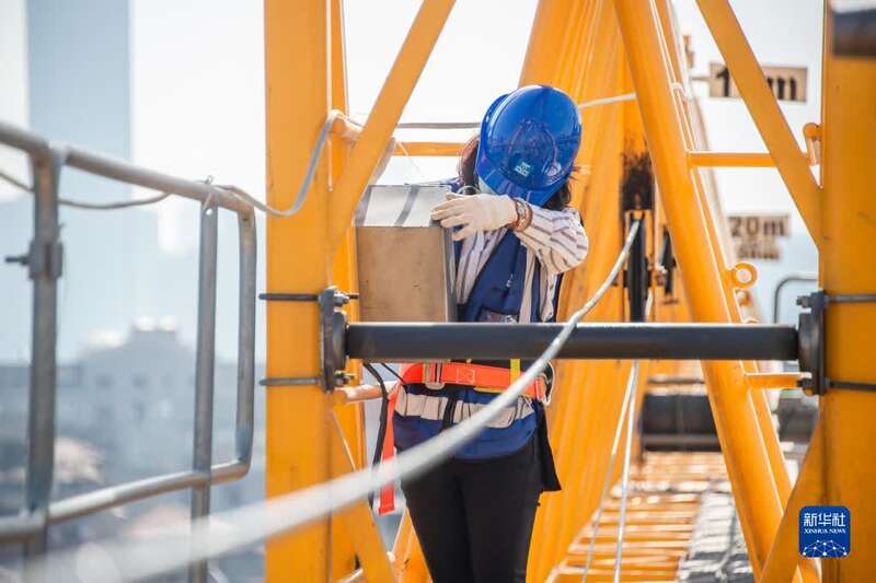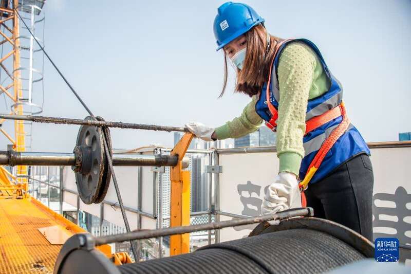 3月8日,在武汉市中建三局总承包公司某工地上,张丽萍在对塔吊吊臂进行安全检查。新华社发(伍志尊 摄)