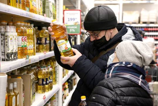 3月5日,俄罗斯鄂木斯克,民众在欧尚超市购物。该超市已对糖、植物油、面粉和盐实行限购。西方制裁导致俄罗斯通货膨胀加剧。俄联邦工业和贸易部宣布,允许俄境内的贸易网点对某些具有社会重要性的商品进行销售限制, 以打击囤积居奇、操纵物价等行为。图片来源 视觉中国