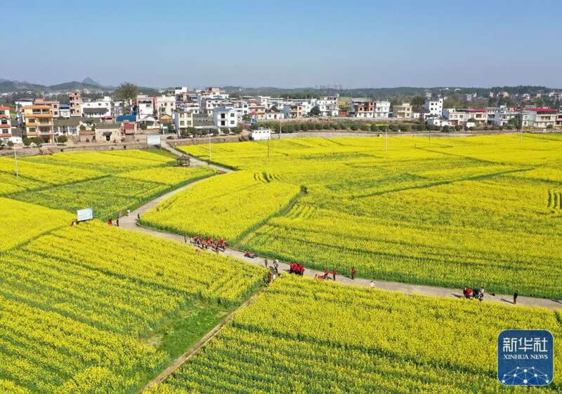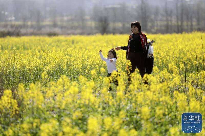 3月8日,游客在湖南省资兴市蓼江镇油菜花海赏景游玩。新华社发(李科摄)