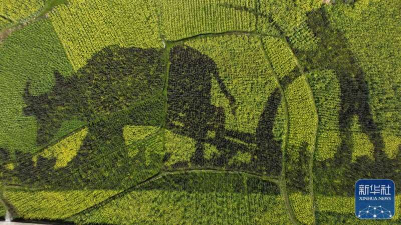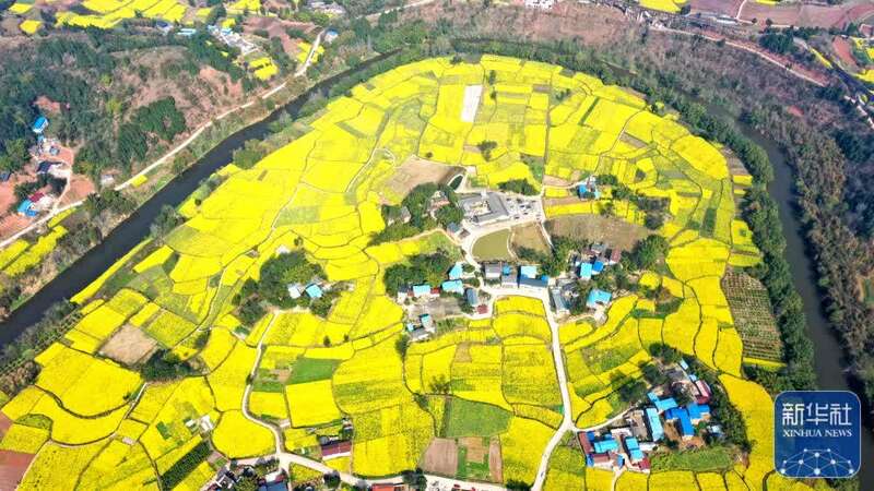 3月8日拍摄的四川省眉山市仁寿县青岗乡盘龙村油菜花田(无人机照片)。新华社发(潘建勇摄)
