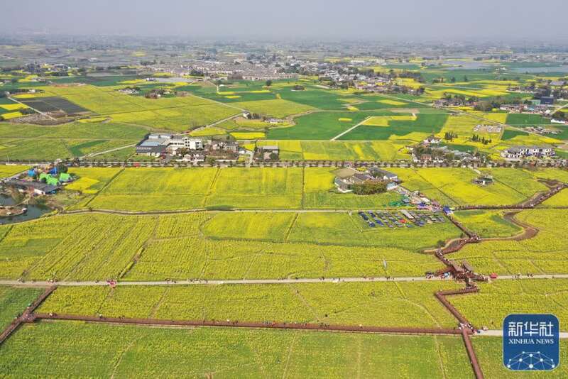 3月8日在四川省广汉市高坪镇李堰村拍摄的油菜花田(无人机照片)。新华社发(李向雨摄)