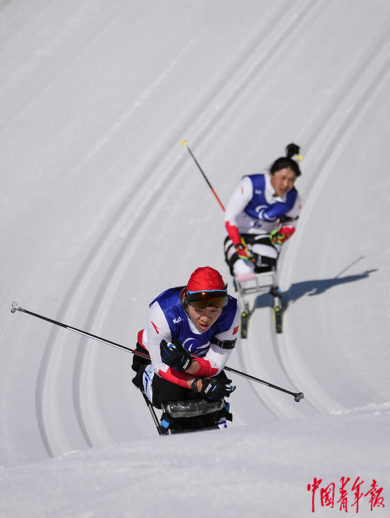 3月8日,中国选手翟雨鑫(左前)、王诗瑀在北京2022年冬残奥会残奥冬季两项女子中距离(坐姿)比赛中。中青报·中青网记者 李峥苨/摄
