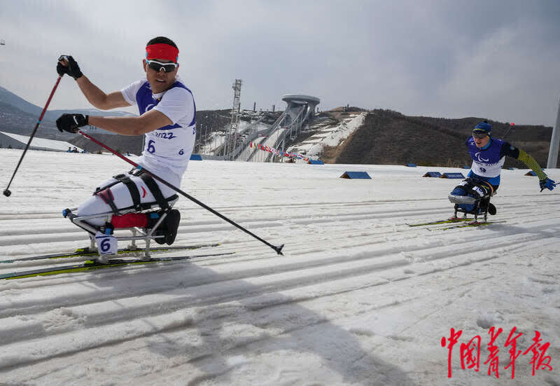 3月9日,北京2022年冬残奥会残奥越野滑雪男子短距离(坐姿)决赛,中国选手王涛(左)在追逐中。他在该项比赛中获得第五名。中青报·中青网记者 李峥苨/摄