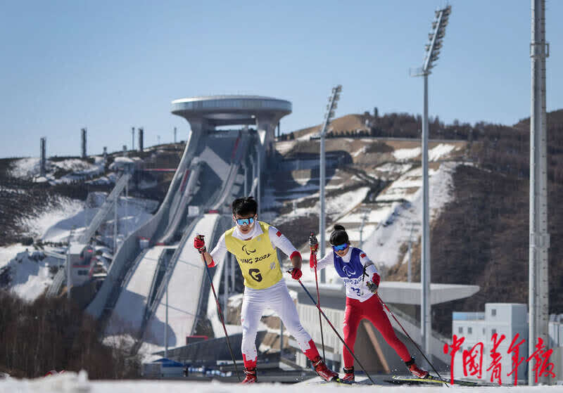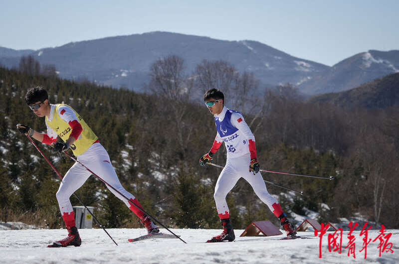 3月8日,北京2022年冬残奥会残奥冬季两项男子中距离(视障)比赛中,中国选手余爽和引导员王官宇在赛道上行进。中青报·中青网记者 李峥苨/摄