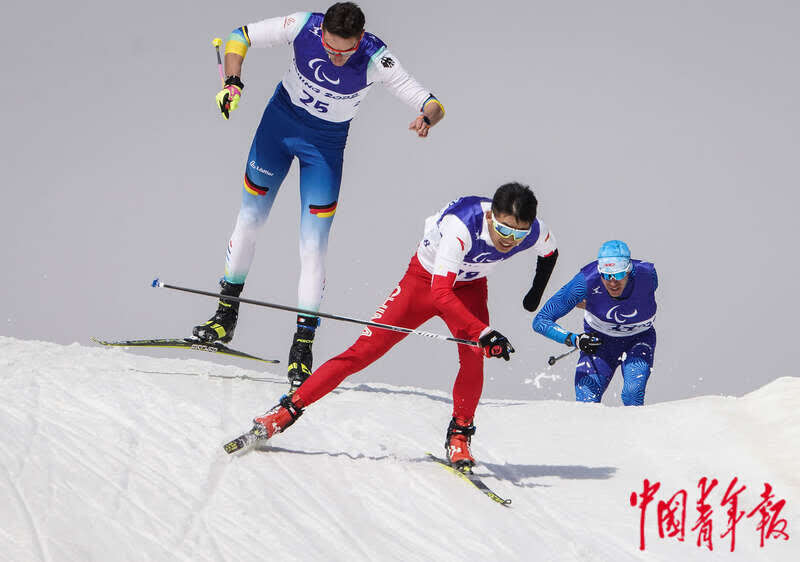 3月9日,中国选手刘晓彬(中)在北京2022年冬残奥会残奥越野滑雪男子短距离(自由技术)站姿比赛中。中青报·中青网记者 李峥苨/摄