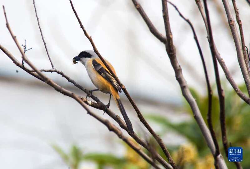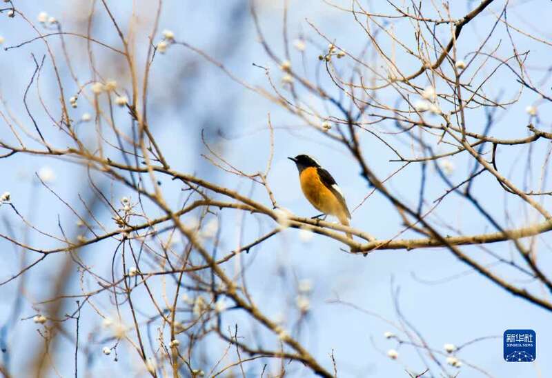 3月10日,在河南三门峡天鹅湖国家城市湿地公园,小鸟在树枝上停留。新华社发(杜杰 摄)