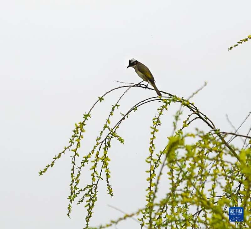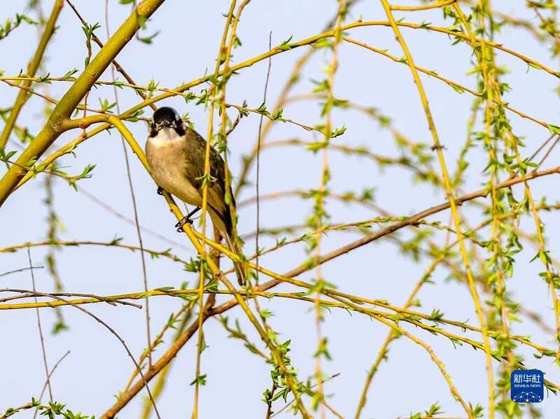 3月10日,在湖南省衡阳市雁峰区湘江边上,一只小鸟停留在柳树枝上。新华社发(汪普林 摄)