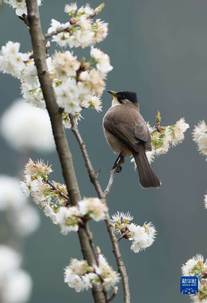 3月10日,在贵州省贵阳市小车河湿地公园,一只小鸟在花间停留。新华社发(邓刚 摄)