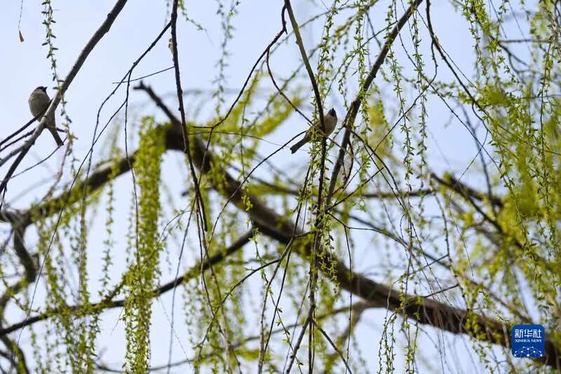 3月10日,在江苏省昆山市旅游度假区锦溪古镇,两只麻雀停留在柳树上。新华社发 (王须中 摄)